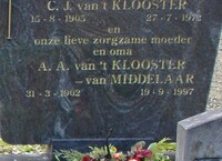 Gehuwd 4 feb 1931 Hoogland, leeftijd 25 jaar akte 6 (41 jaar gehuwd) Graf Knelis van 't Klooster en Toontje van Middelaar Graf Knelis van 't Klooster en Toontje van Middelaar met: Antonia Alijda "Toontje" van Middelaar, leeftijd bij huwelijk 28 jaar, dochter van Peter van Middelaar en Maria van Zuilen.Geboren 31 mrt 1902 Stoutenburg akte 5, overleden 19 sep 1997 Soest, leeftijd 95 jaar, begraven 23 sep 1997 Soest in het familiegraf op het parochiekerkhof aan de Dalweg (bekijk bidprentje)